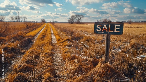 A 'sale' sign stands on a plot of land, a stark reminder of agricultural bankruptcy and unprofitable farming.