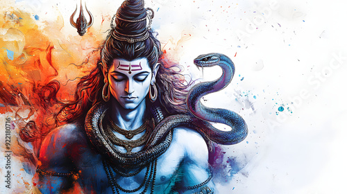 Beautiful digital painting of lord Shiva with divine serpent on white background for sale