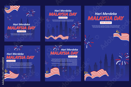 Social media post template and poster for Malaysian Independence Day. with flags, buildings and firecrackers. for greeting cards and posters