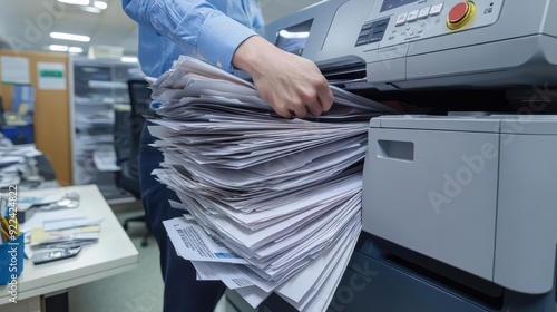 A clumsy office worker accidentally jams the office printer with too much paper