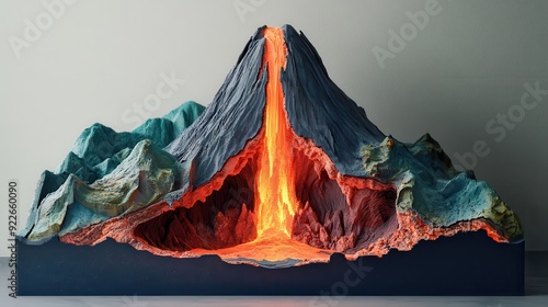 3D Render of a Volcanic Eruption with Cross Section, Abstract Landscape with Lava Flowing, Digital Art.