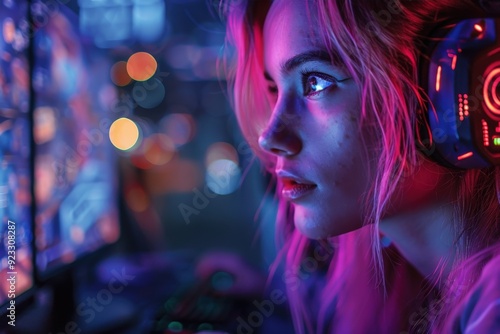 A girl gamer immersed in an intense gaming session, set in a colorful ambiance with vibrant lights, using a multi-monitor setup and high-quality headset for an enhanced experience.