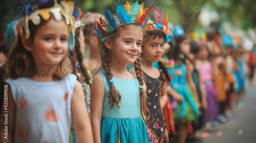 A line of children in creative costumes, parading through the school, filled with pride and happiness. Creation, School Spirit, Joy