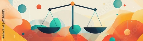 Abstract illustration of balance scales symbolizing justice and fairness, set against a colorful backdrop with vibrant shapes.