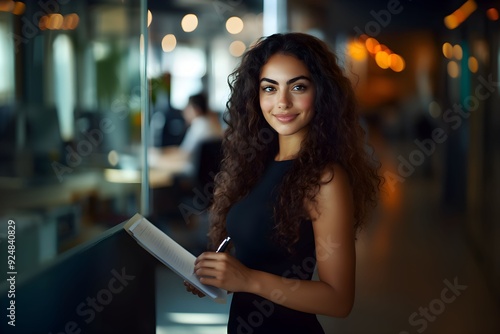 "zbliżenie, europejska kobieta, elegancka, długie kręcone włosy, uśmiechnięta, pewna siebie, korporacyjne biuro, dynamiczna atmosfera, biurka, komputery, współpracownicy,