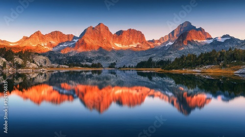 Majestic Mountain Range Reflected in Serene Lake at Sunset - A panoramic view of a majestic mountain range with snow-capped peaks reflected in a still lake at sunset. The vibrant colors of the sky, th