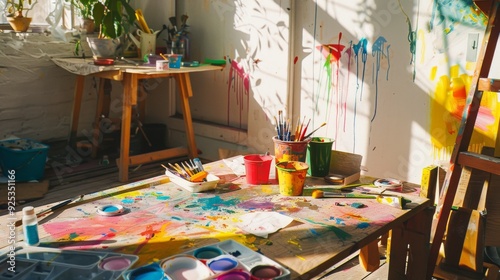 An artist's studio with a sunlit worktable, paint splatters cover the surface, with brushes, paints, and canvases strewn about, embodying creative chaos.