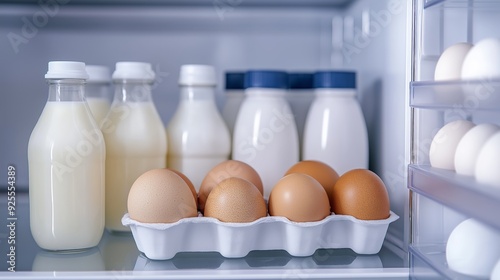 Different milk products with eggs in the fridge.