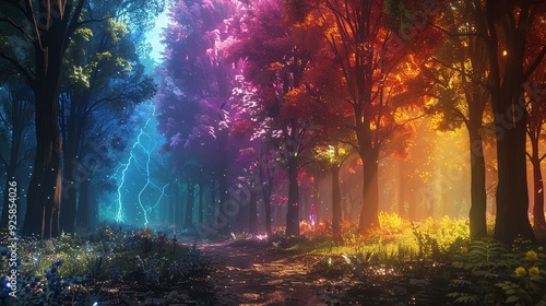 landscape in a fabulous forest, rainbow spectrum of colorful autumn trees in unusual neon lighting, fog background autumn fantasy.