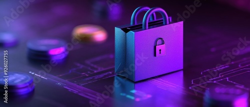 Secure Online Shopping Concept with Digital Lock and Shopping Bag on Futuristic Background