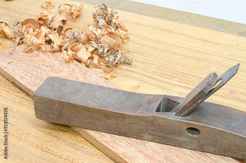 Shavings after planing of wood ash on the background of the plane close up.DIY concept. Woodworking and crafts tools. Carpentry hand tools. Wooden