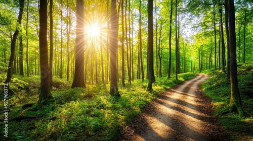 Sunlight Streaming Through Trees in a Forest.