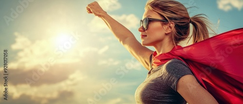Empowered woman in sunglasses and a red cape stands confidently against a bright sky, embodying strength and determination.