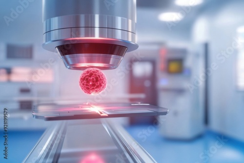 An ionizing radiation beam targets tumor cells, with precise oncology diagnosis in progress.