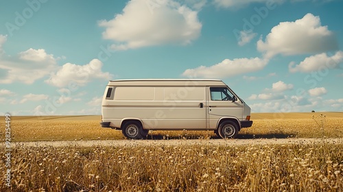 White van parked on a scenic dirt road under a blue sky with fluffy clouds.