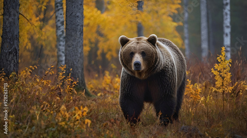 Brown bear walking in autumn forest. Scientific name: Ursus arctos.