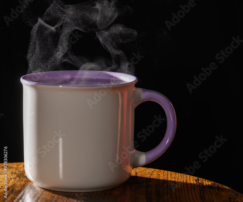 Para wodna unosząca się nad porcelanowym kubkiem na czarnym tle