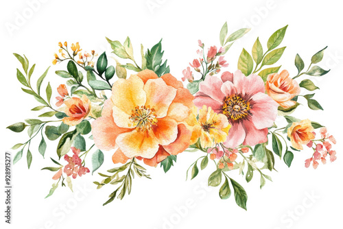 Beautiful watercolor floral arrangement with vibrant orange and pink flowers, perfect for wedding invitations and decor.