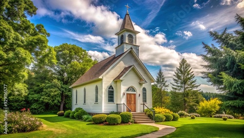 Small, serene, and stylish white church with a classic steeple and wooden doors set amidst lush greenery on a peaceful countryside landscape.