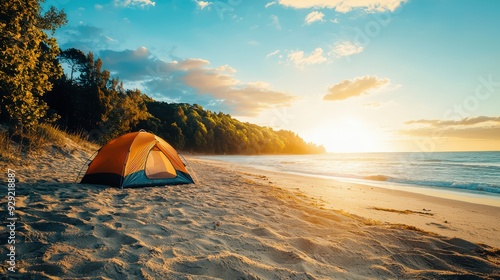Opis: Photo of a beach with a camping tent set up on the sand, under the sun. The scene captures a relaxed, outdoor vibe with clear beach and sunny weather.