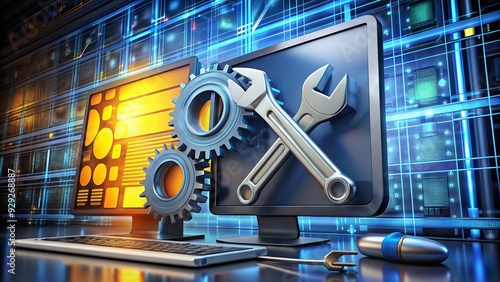 Website under construction sign on a computer screen with a wrench and hammer surrounded by coding snippets and clockwork gears in the background.