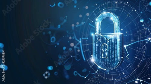 A glowing padlock with binary code inside on a dark blue background with glowing geometric shapes