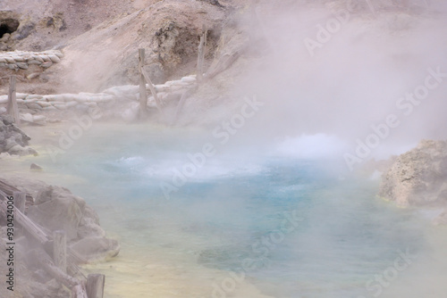 Vibrant Geothermal Pool Amidst Volcanic Terrain in Tamagawa Onsen, Akita, Japan