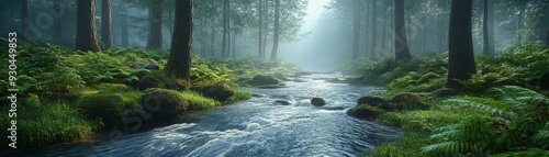 Misty morning river flowing through a dense forest, Misty morning forest river, Mystical and serene dawn