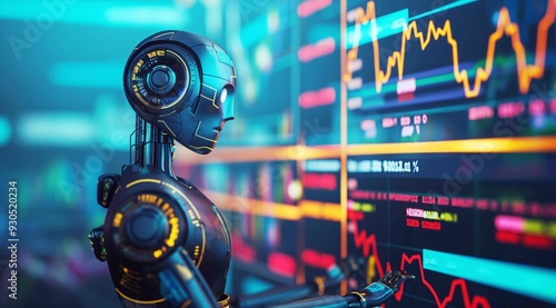 3D rendering of a humanoid robot analyzing a stock market chart with trading charts. Concept of artificial intelligence in financial markets, neon lighting, copy space.