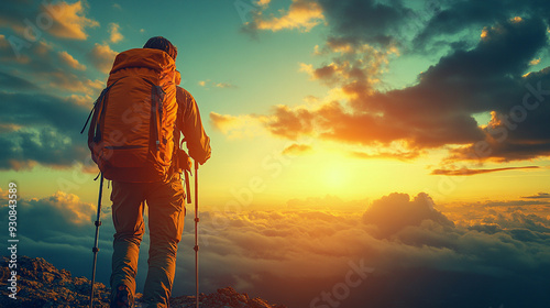 lone man hikes up a snowy mountain trail, facing away, highlighting solitude and perseverance in a winter landscape