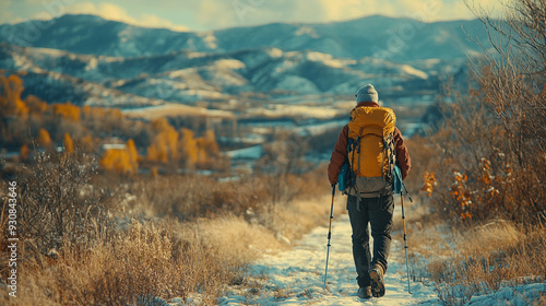 lone man hikes up a snowy mountain trail, facing away, highlighting solitude and perseverance in a winter landscape