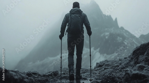 lone man hikes up a snowy mountain trail, facing away, highlighting solitude and perseverance in a winter landscape