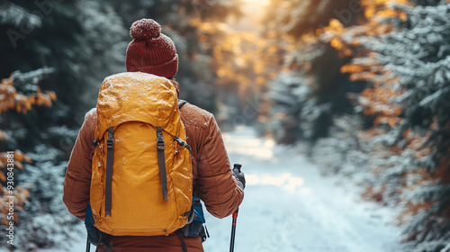 lone man hikes up a snowy mountain trail, facing away, highlighting solitude and perseverance in a winter landscape