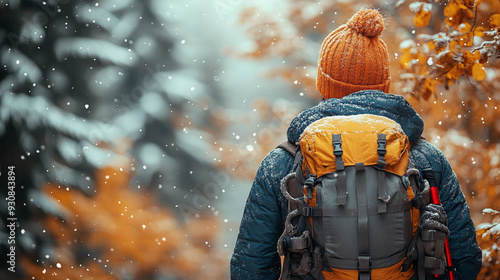 lone man hikes up a snowy mountain trail, facing away, highlighting solitude and perseverance in a winter landscape