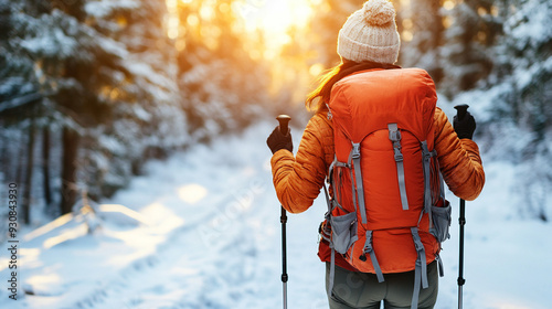 lone man hikes up a snowy mountain trail, facing away, highlighting solitude and perseverance in a winter landscape