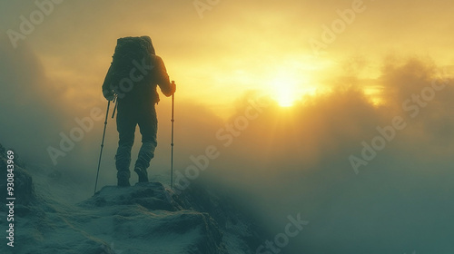 lone man hikes up a snowy mountain trail, facing away, highlighting solitude and perseverance in a winter landscape