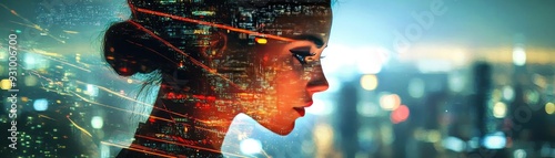 A profile portrait of a woman with a vibrant cityscape overlay, symbolizing innovation and the fusion of technology and humanity.