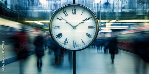 A close-up of a clock in a transit station, with motion blur capturing the rush of commuters passing by below