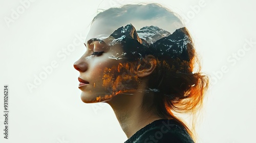A serene portrait featuring a woman with a mountain landscape superimposed, symbolizing introspection and nature's beauty.