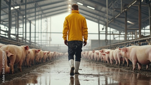 A man in a yellow jacket walks through a muddy pig pen, surrounded by pigs.