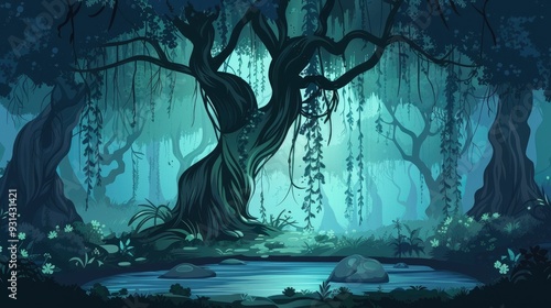 A Silhouetted Tree by a Creek in a Forest at Dusk