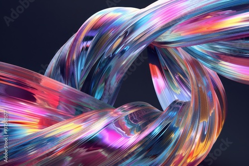 An abstract 3D shape resembling twisted ribbons, with holographic effects and a vibrant spectrum of colors.