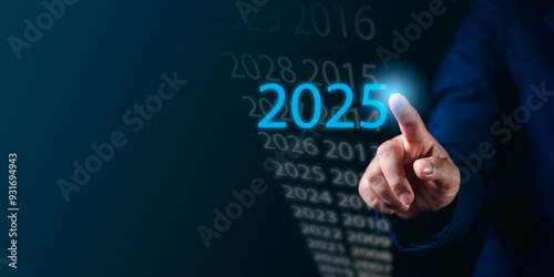 Businessman's Hand Displaying a Virtual Screen with 2025 Investment Analysis Exploring Future Market Trends, Financial Forecasts, and the Role of Technology in Strategic Planning