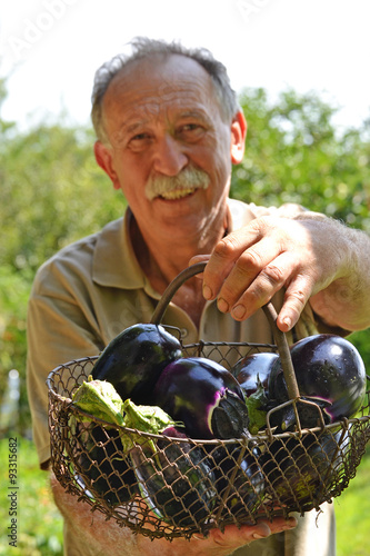 Agricultor contento sujetando canasta de berenjena del cultivo,