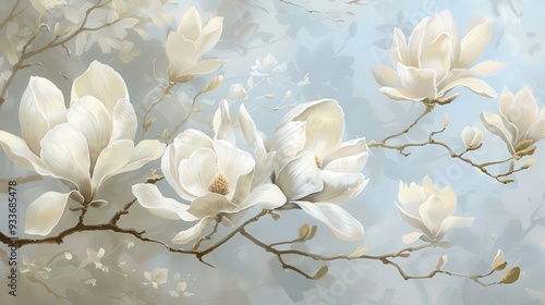 Artistic view of a flowering magnolia tree with large, creamy white blossoms, adding elegance and grace to a springtime landscape