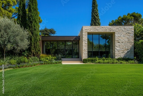 The design blends modernist and contemporary styles with a cozy feel. It features natural stone, large glass panels with black frames, and ample natural light. The garden includes elegant Italian cypr