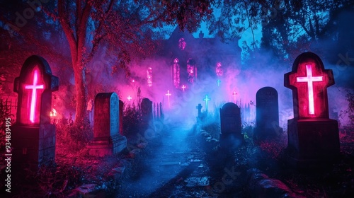 A graveyard with a church in the background and a cross on each tombstone