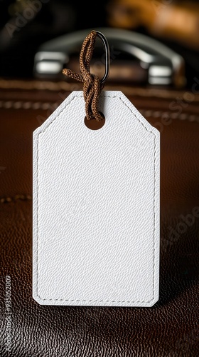 Blank luggage tag on a suitcase, travel-themed background