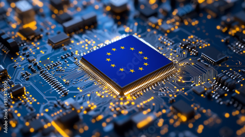 Close-up of a microchip with the EU flag, symbolizing Europe's advancements in technology and digital sovereignty.