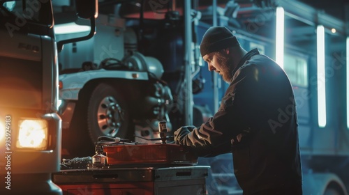 A mechanic in a beanie, illuminated by cool workshop lights, concentrates on repairing part of a large truck.